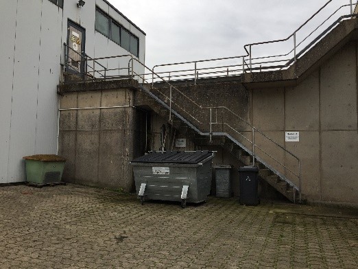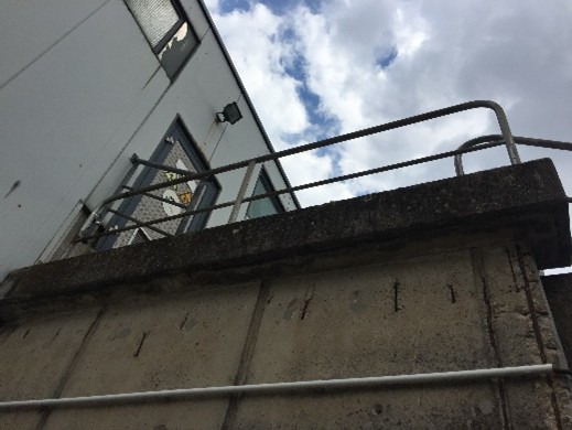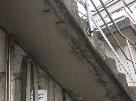 - Vermehrte Abplatzungen und korrodierte Stahlbewehrung an den Außenwänden und der Untersicht der Treppe